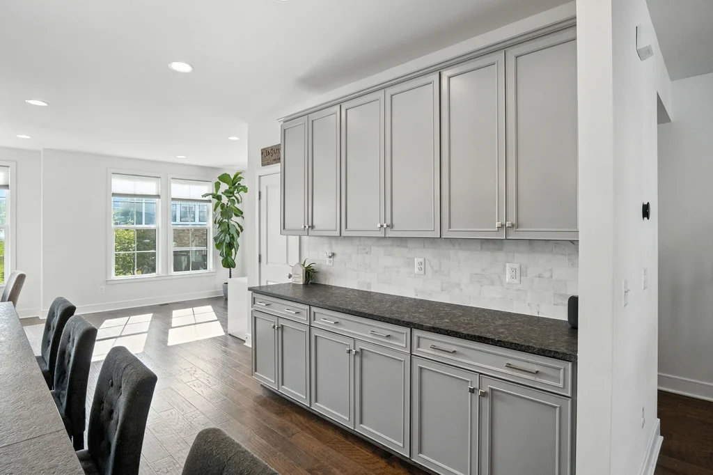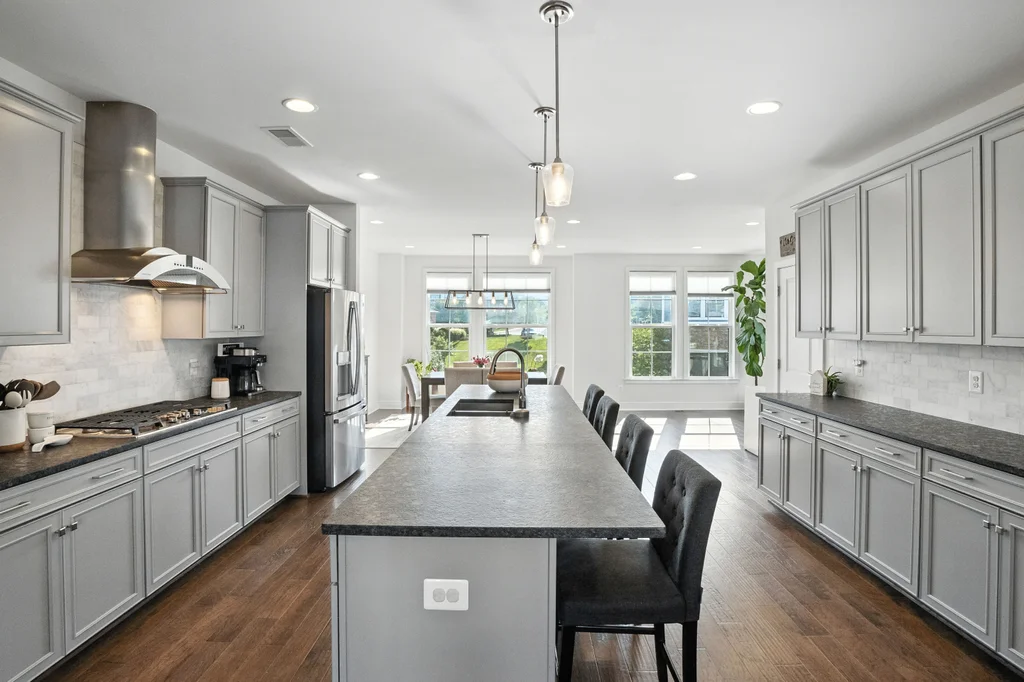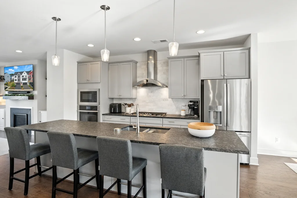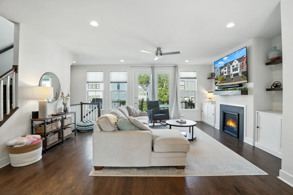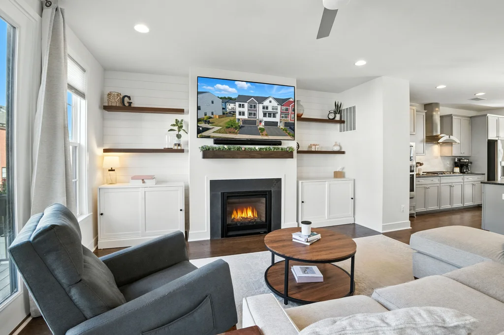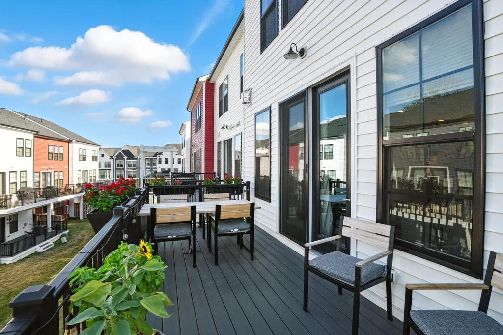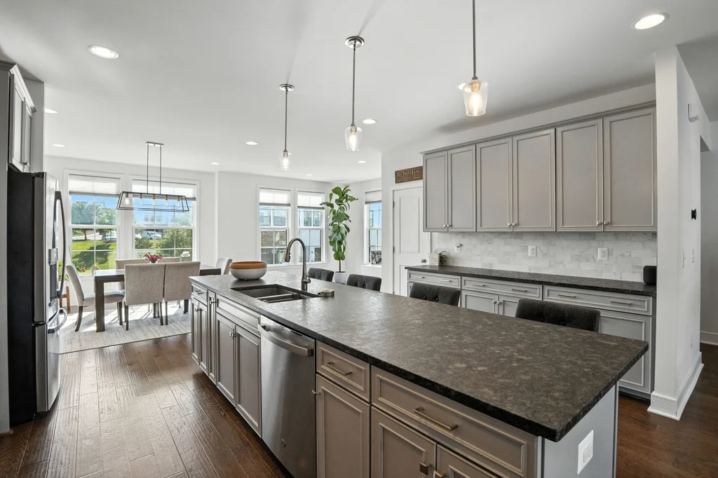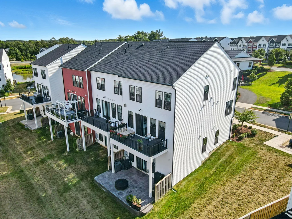 Welcome home to this beautifully upgraded 2020 Van Metre Carver model end-unit townhome, where thoughtful design and custom finishes set it apart. Flooded with natural light, the open-concept main level of this 2800+ sq ft lay out, showcases a gourmet kitchen with custom cabinetry, a striking tile backsplash extended to the ceiling behind a custom exhaust hood, and an impressive 11+ foot leather-finished granite island that anchors the space. The kitchen flows seamlessly into the expansive dining room and family room, where a gas fireplace with custom shiplap and built in shelving create a warm, inviting centerpiece. And open to your Trex deck—ideal for morning coffee or evening gatherings. Across three finished levels, this home offers three bedrooms, two full baths, two half baths, and a two-car garage. Oversized hallways, wide staircases, and upstairs loft/sitting area, add to the sense of space. The primary suite is a true retreat with a custom tray ceiling, walk-in closet and a spa-like bath featuring a frameless shower. Large secondary bedrooms each have custom detailed wall design and their own walk in closet. There is also a guest bath with custom tile and bedroom level laundry. The walkout lower level boasts soaring 13-foot ceilings, a custom built-in office nook, and a flexible living area that open to a 22’x15’ stamped concrete patio. Notable features include custom board-and-batten trim in the foyer, custom stone and tile in kitchen and baths, and extra windows on the end unit provide abundant natural light throughout. Perfectly located near shopping, dining, fitness and recreation centers, top Loudoun wineries and breweries, including the new Lark Brewery, and just minutes from Routes 50, 28, 606, 267, and Dulles International Airport, this home blends comfort, convenience, and modern Loudoun living.