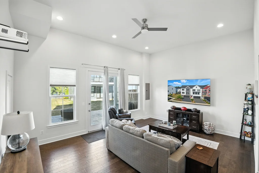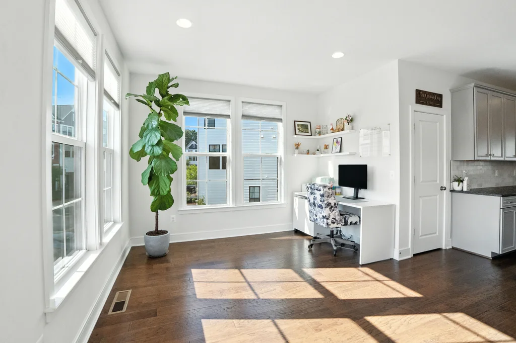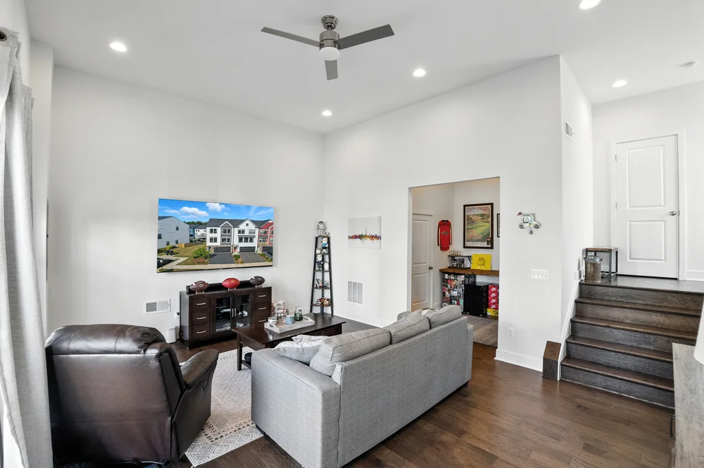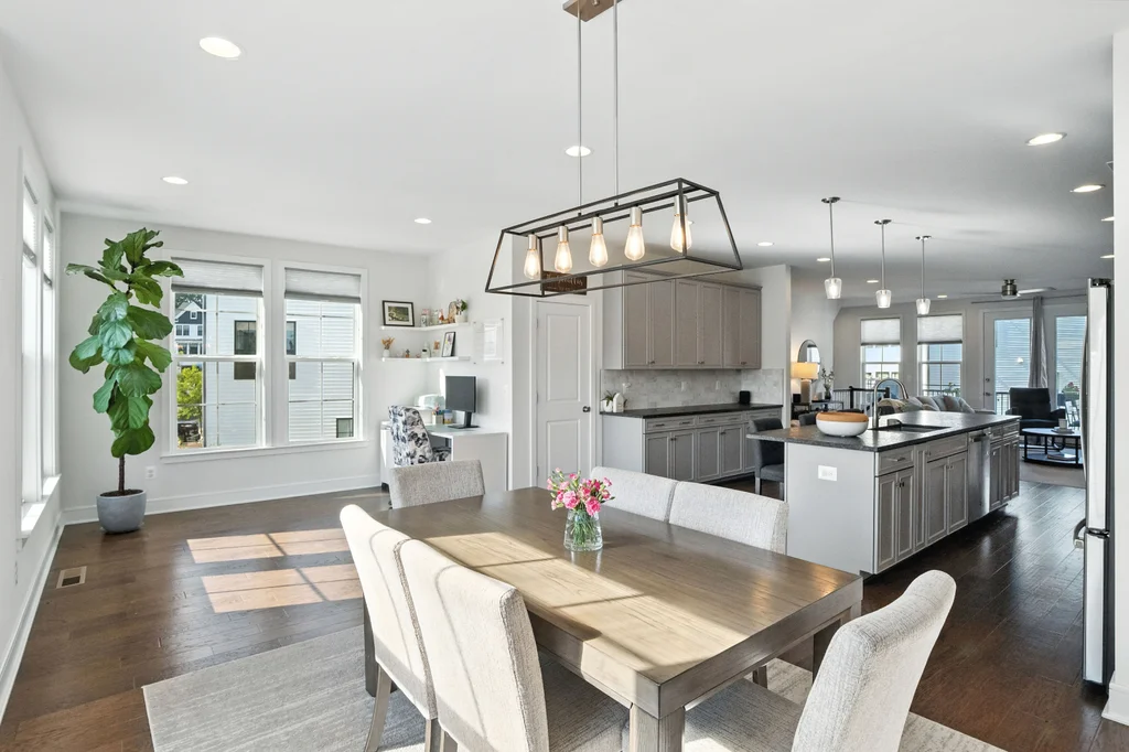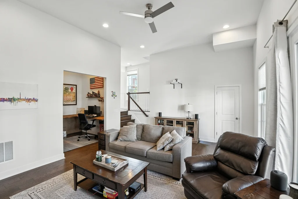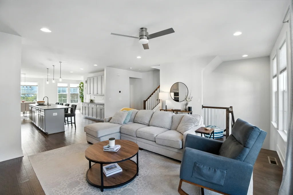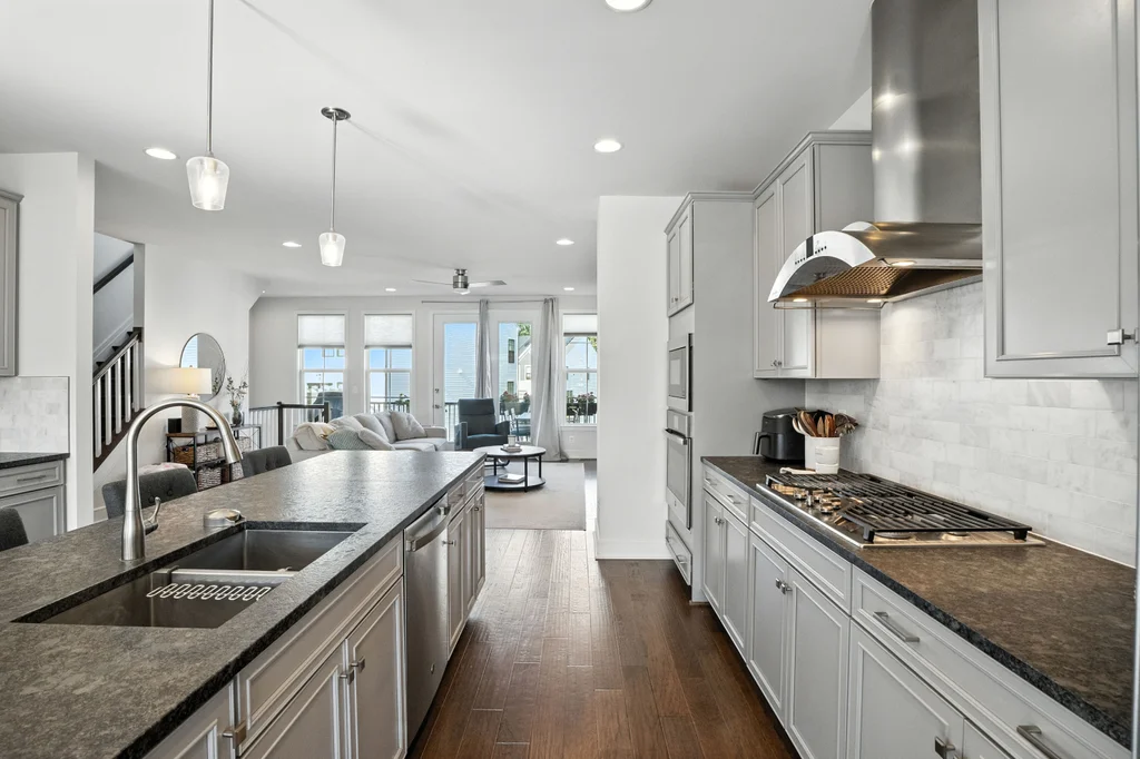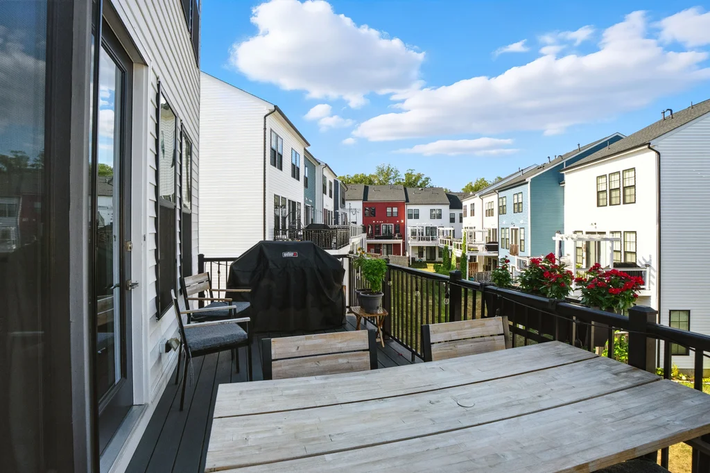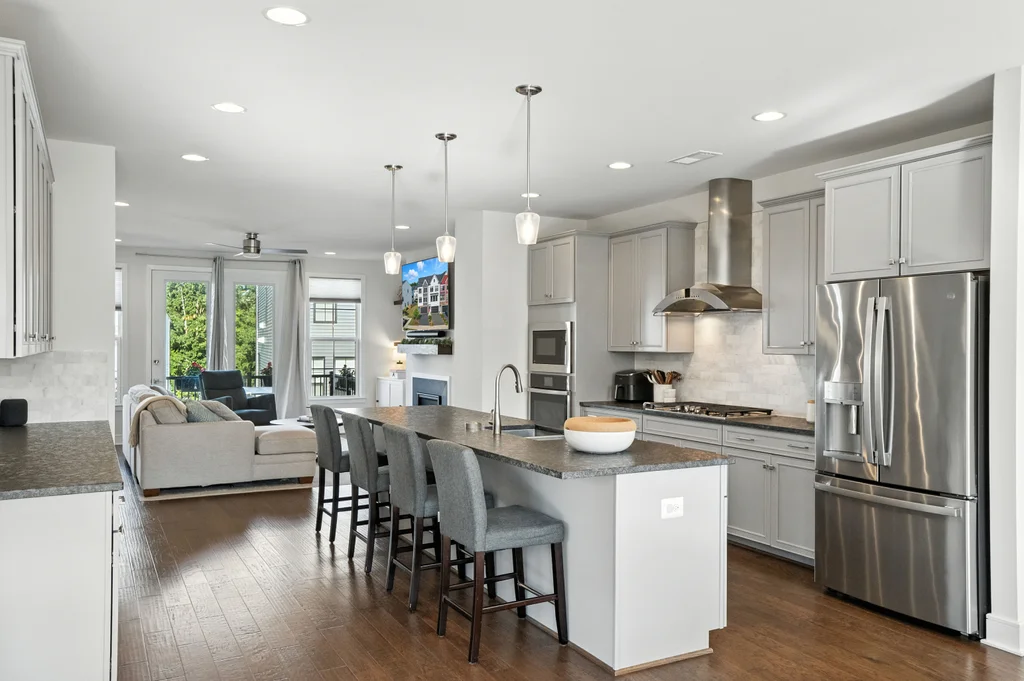 Welcome home to this beautifully upgraded 2020 Van Metre Carver model end-unit townhome, where thoughtful design and custom finishes set it apart. Flooded with natural light, the open-concept main level of this 2800+ sq ft lay out, showcases a gourmet kitchen with custom cabinetry, a striking tile backsplash extended to the ceiling behind a custom exhaust hood, and an impressive 11+ foot leather-finished granite island that anchors the space. The kitchen flows seamlessly into the expansive dining room and family room, where a gas fireplace with custom shiplap and built in shelving create a warm, inviting centerpiece. And open to your Trex deck—ideal for morning coffee or evening gatherings. Across three finished levels, this home offers three bedrooms, two full baths, two half baths, and a two-car garage. Oversized hallways, wide staircases, and upstairs loft/sitting area, add to the sense of space. The primary suite is a true retreat with a custom tray ceiling, walk-in closet and a spa-like bath featuring a frameless shower. Large secondary bedrooms each have custom detailed wall design and their own walk in closet. There is also a guest bath with custom tile and bedroom level laundry. The walkout lower level boasts soaring 13-foot ceilings, a custom built-in office nook, and a flexible living area that open to a 22’x15’ stamped concrete patio. Notable features include custom board-and-batten trim in the foyer, custom stone and tile in kitchen and baths, and extra windows on the end unit provide abundant natural light throughout. Perfectly located near shopping, dining, fitness and recreation centers, top Loudoun wineries and breweries, including the new Lark Brewery, and just minutes from Routes 50, 28, 606, 267, and Dulles International Airport, this home blends comfort, convenience, and modern Loudoun living.